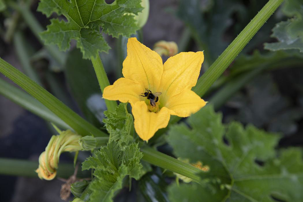 De bestuiving, door bijen, moet op het juiste moment plaatsvinden. Daarvoor hebben ze op het bedrijf altijd enkele bijenkasten staan. Na de bestuiving groeit het vruchtbeginsel van de vrouwelijke bloem uit tot een courgette. Gemiddeld snijden ze in één seizoen zo'n twintig courgettes van één plant!