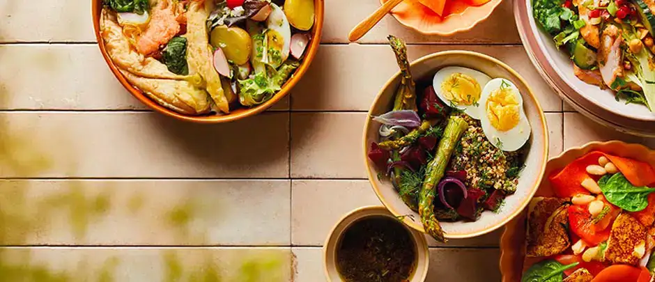 Heb je liever een stevige salade waar je goed van vol zit? Maak dan een maaltijdsalade! Deze maak door de groenten in je salade aan te vullen met koolhydraten en eiwitten. Gebruik voor je koolhydraten bijvoorbeeld (volkoren) pasta, rijst, quinoa of bulgur. Voor de eiwitten kan je bijvoorbeeld vis, kaas of peulvruchten kiezen. Zo eet je lekker licht maar toch voedzaam op de warme dagen. Je kunt eindeloos variëren met de ingrediënten en 'm helemaal aanpassen aan ieders smaak én aan het seizoen.