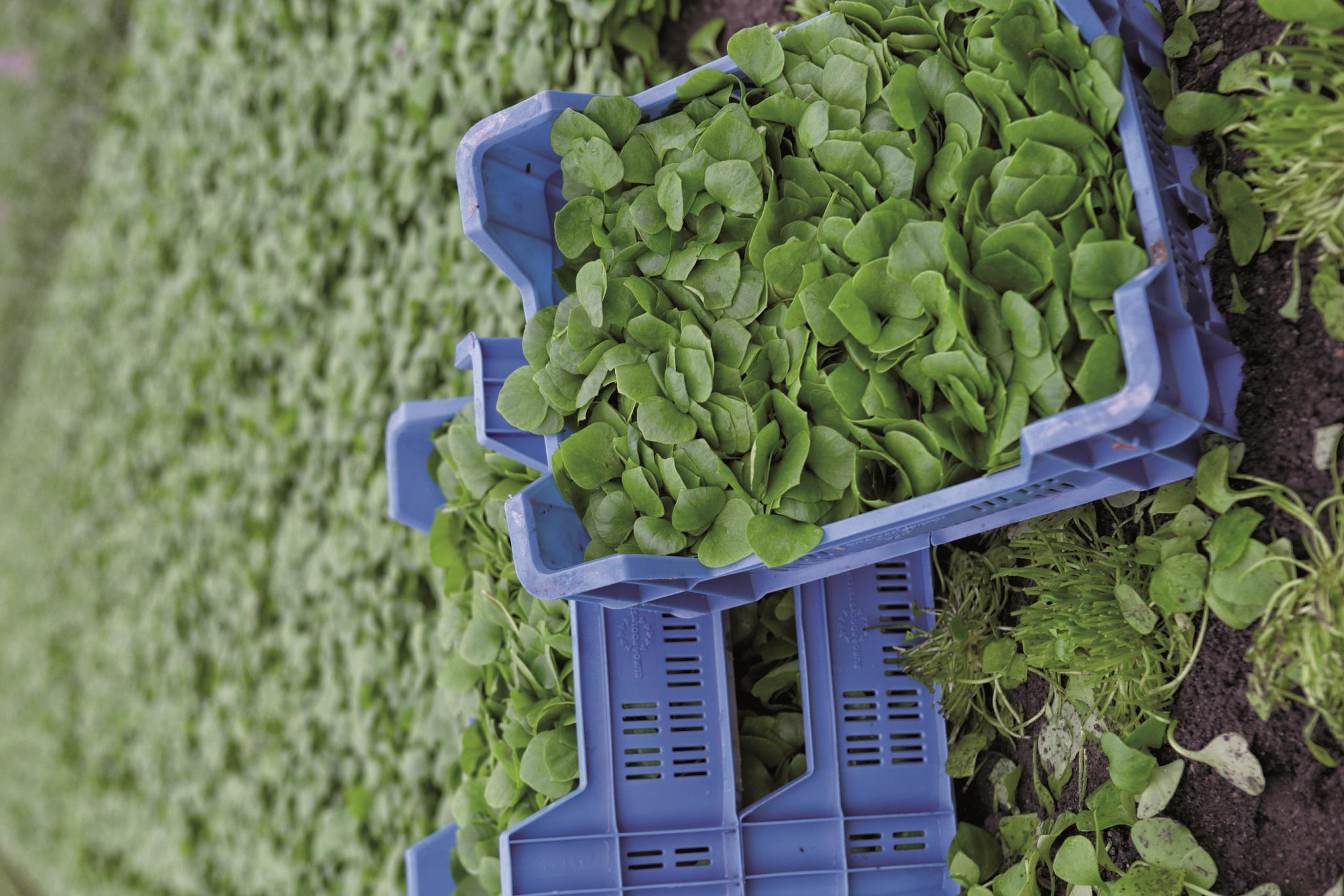“Kijk, prachtig toch? Voor mij is dit de meest wonderbaarlijke groente die er is. Ondanks dat het in de koude kas staat, groeit het zó mooi. Alleen als het kwik onder nul komt bevriest de plant en kan ik niet oogsten. Gelukkig overleeft winterpostelein de vorst, dus zodra de zon op mijn kas schijnt en de temperatuur omhoog schiet, ga ik door met oogsten. De eerste plantjes zet ik in de tweede helft van september in de grond. Dat doe ik daarna nog zo’n zes keer. Van de eerste plantjes kan ik drie keer oogsten. Ik snijd de blaadjes handmatig van het hart af, zodat er weer nieuwe kunnen groeien. De winterpostelein groeit dan zó hard, dat wanneer ik mij bij wijze van spreken even omdraai en weer omkijk, er nieuwe postelein is om te oogsten."