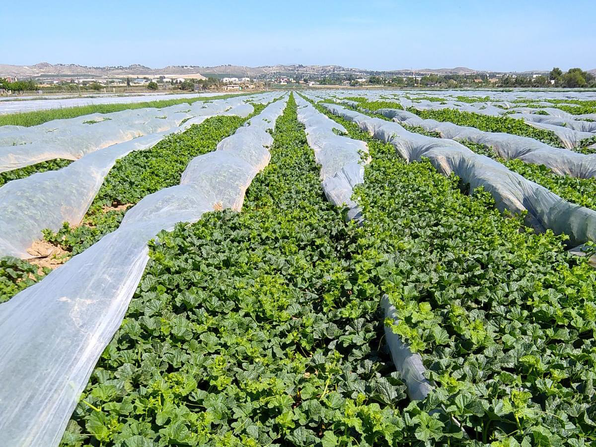 - De biologische planten worden geïrrigeerd met 'druppelirrigatie'. Hierdoor gaat het water rechtstreeks naar de wortels van de planten en verspillen we geen water. De eerste 30 dagen na het planten zijn de meloenplanten bedekt met thermisch vlies om ze warm te houden en de groei te bevorderen.