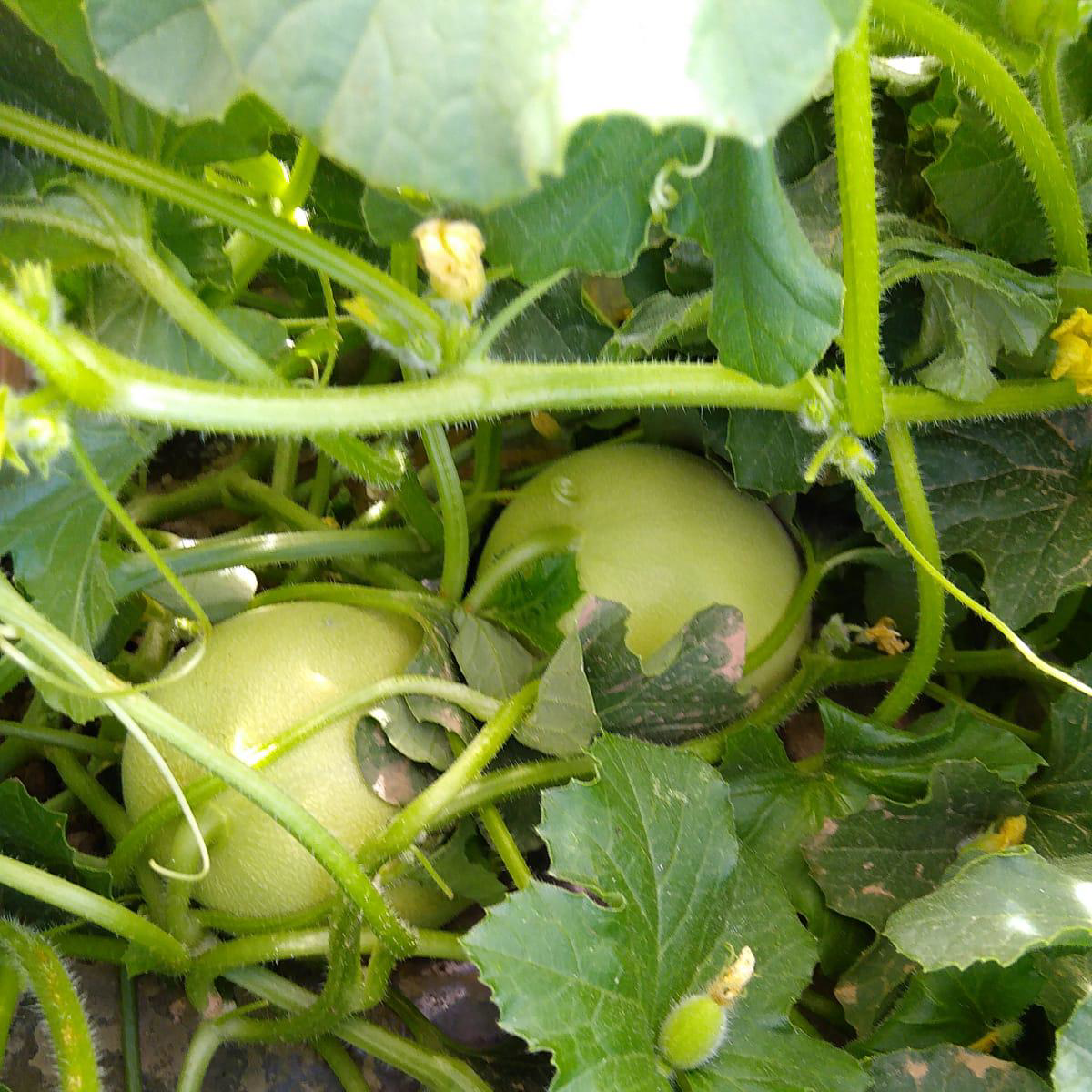 - Als de planten groot en sterk genoeg zijn wordt het vlies verwijderd. Zo'n 55 tot 60 dagen later zijn de meloenen klaar voor de oogst!