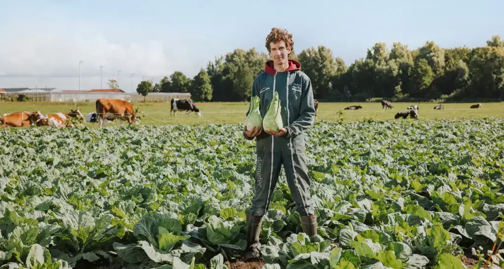 Op Warmonderhofstede in Dronten groeien niet alleen groenten van Ekoplaza, maar ook een nieuwe generatie jonge boeren. Akkerbouwer Florian Ghyselinck bijvoorbeeld. Voor hem is spitskool telen een les in samenwerken met de natuur.
